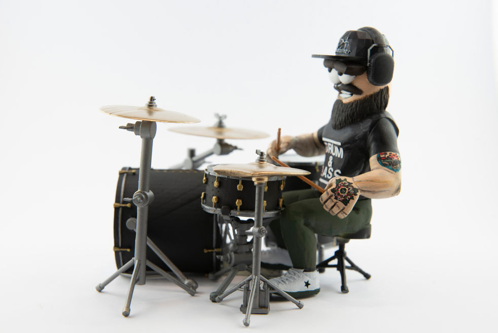 The drum set includes a bass drum, snare, and hi-hat, along with ride and crash cymbals.